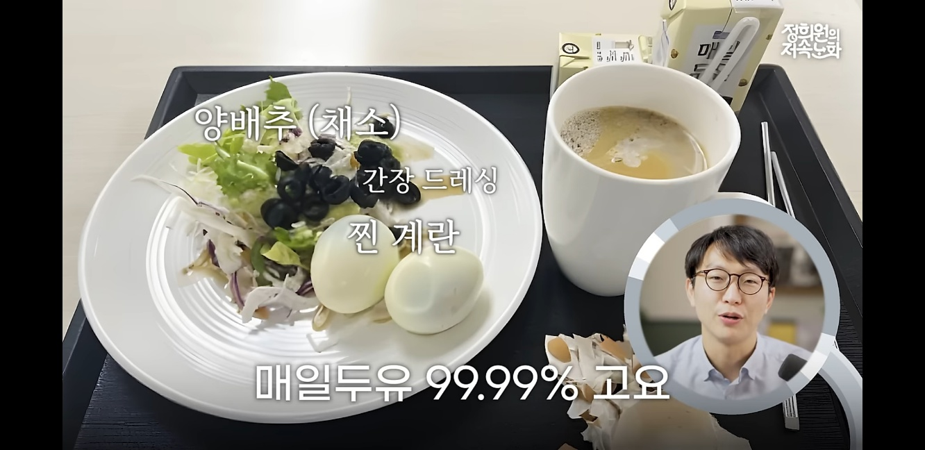 다음은 정희원 교수님의 아침 식단입니다. 컵에는 에스프레소 원두에 두유99.9%원액 섞은 모닝커피랍니다.