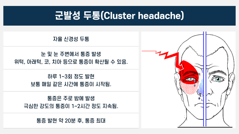 군발두통은 통증이 매우 극심해서 ‘자살두통’이라고도 불릴 만큼, 적극적인 치료와 예방이 필요하답니다.