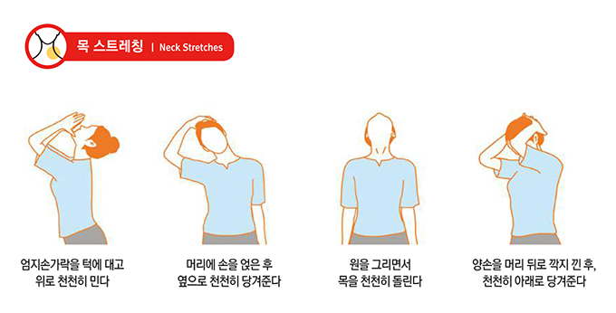 간단한 목 돌리기, 어깨 돌리기 스트레칭을 하루 2~3번씩 실천해보세요.