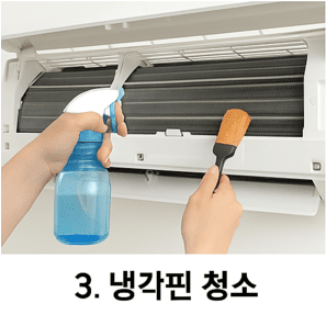 - 냉각핀 청소: 전용 브러시나 에어컨 클리너 스프레이를 사용하여 내부 열교환기(냉각핀)를 청소합니다.