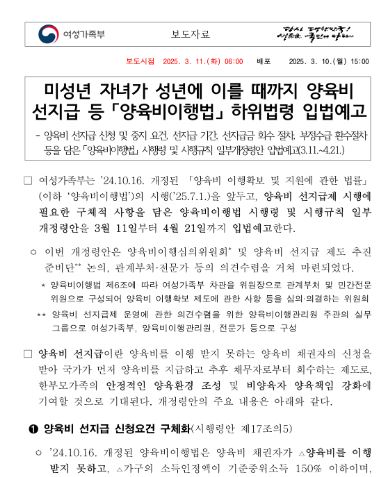 2025년 7월부터 양육비 선지급제가 시행되어, 한부모가족이 양육비를 받지 못하는 경우 국가가 먼저 양육비를 지급하고 채무자에게 회수하는 제도가 도입됩니다. 지원 대상은 기준 중위소득 150% 이하 한부모가족이며, 자녀 1인당 월 20만 원이 지원됩니다.