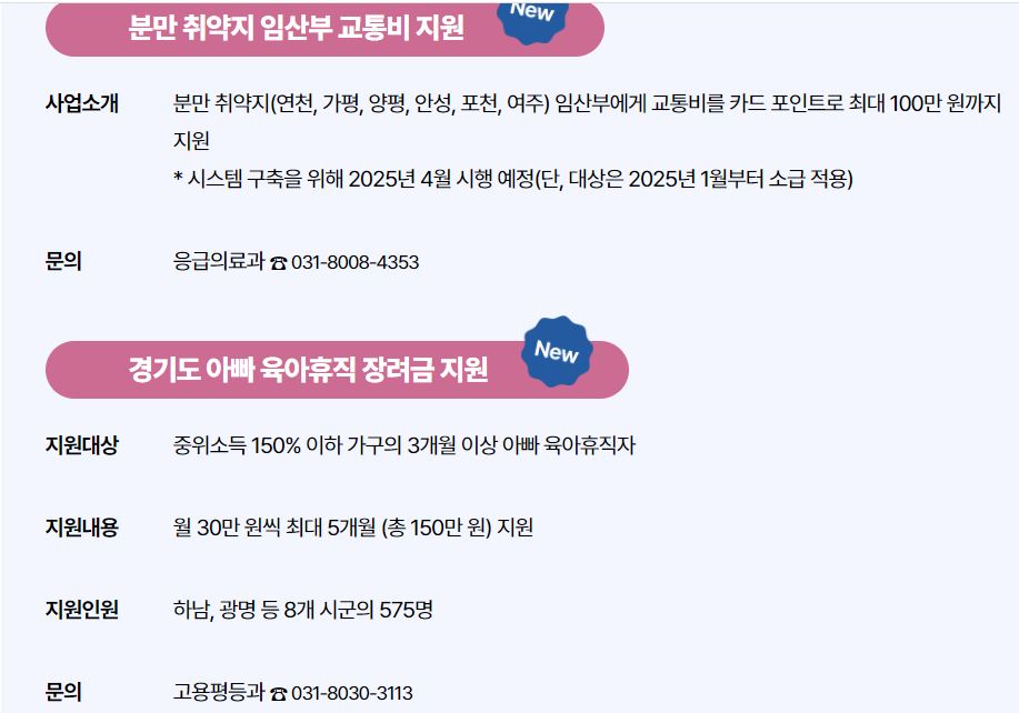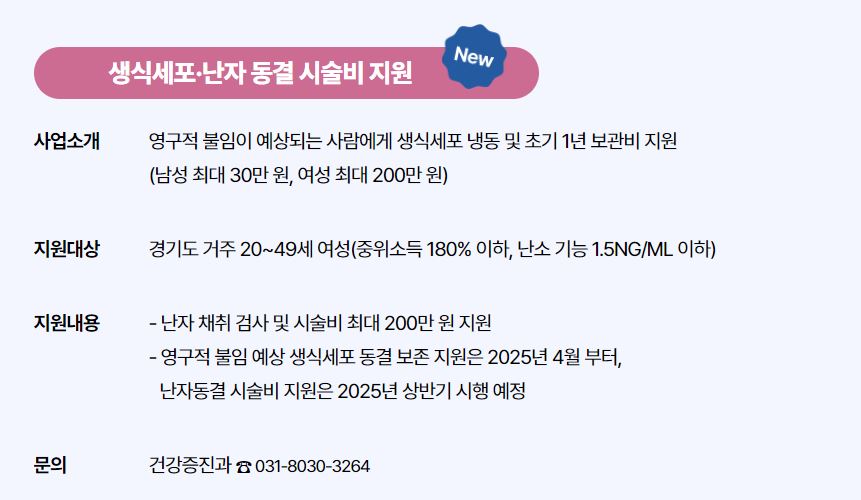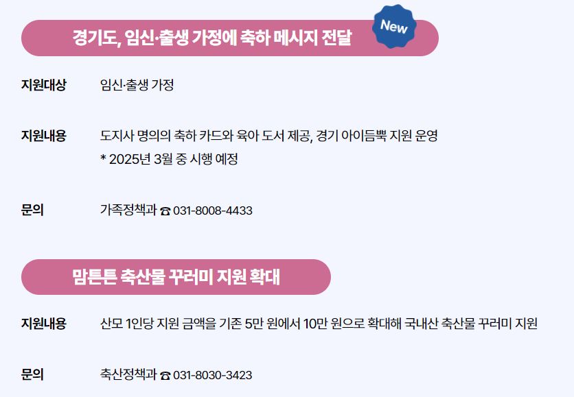 경기도에서는 임신·출산 가정을 위한 다양한 지원이 확대됩니다. 생식세포·난자 동결 시술비 지원, 임신·출생 가정에 축하 메시지와 육아 도서 제공, 맘튼튼 축산물 꾸러미 지원 등이 포함되어 있습니다. 자세한 내용은 경기도청 홈페이지를 참고하시기 바랍니다.