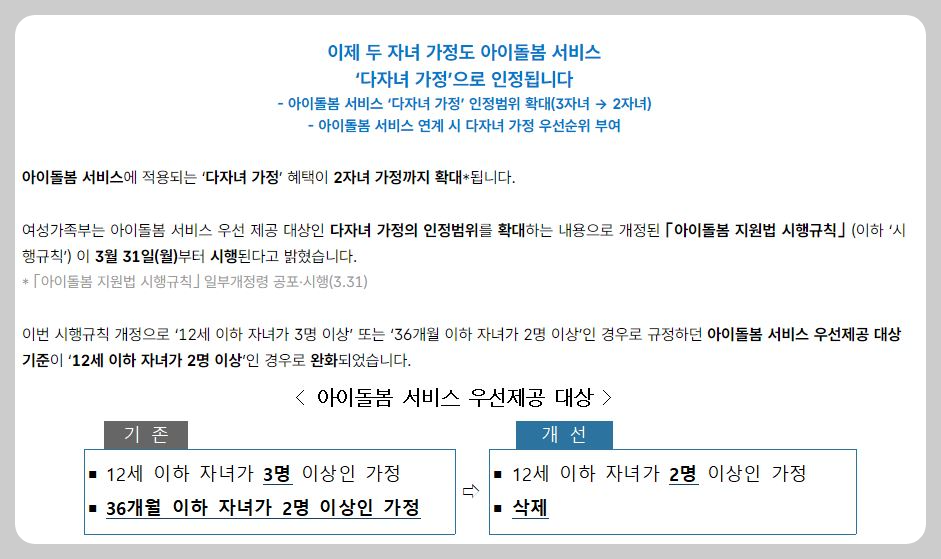 올해 3월 31일부터 다자녀 가정이 3자녀에서 2자녀로 인정범위를 확대하여 아이돌봄서비스를 지원할 예정입니다. 두 자녀도 아이돌봄 서비스 연계 시 우선순위를 부여받을 수 있게 되었습니다.