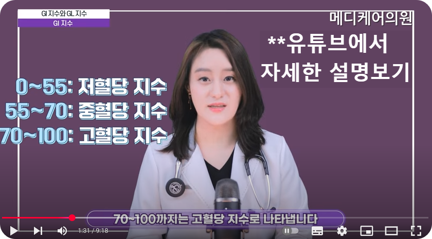 | 70 이상 | 고 GI (혈당 급상승) | 흰쌀밥, 식빵, 감자 |